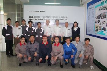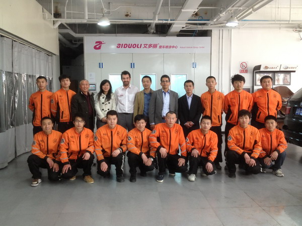 2013年特邀國外專家赴北京車爵士演示車縫泡膠條的使用 2013-04-08 11907 本司訊:2013年4月北京晴空萬里,龍神公司特邀英國專家一行五人,來到了北京車爵士進行汽車噴涂遮蔽技術交流。首先公司一行了解車爵士的汽車噴涂情況及詢問了使用的遮蔽工具情況。隨后英國專家針對在汽車噴漆時難噴涂的車門縫隙、玻璃死角等地方的專業遮蔽工具的演示。車縫泡沫膠:用于車身所有縫隙的遮蔽,有效隔離及遮蔽漆霧噴入車縫里。
