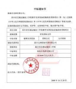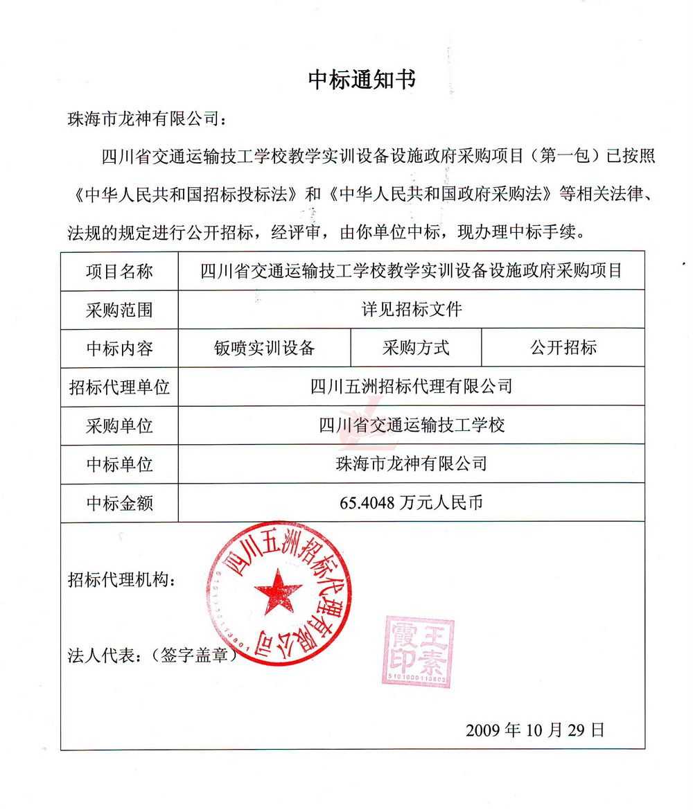 [喜訊]熱烈祝賀龍神成功中標-四川省交通運輸技工學校 [喜訊]熱烈祝賀龍神成功中得四川省交通運輸技工學校標 [新聞中心]珠海市龍神有限公司經過長時間的籌備已成功中得四川省交通運輸技工學校教學實訓設備設施政府采購項目標,這是珠海市龍神有限公司一種實力的表現。說明了珠海龍神的品牌在不斷的加強、深化。 珠海龍神公司一直專業、效率、服務、環保。同時“龍神”在創新中求發展,在發展中求創新的原則。 (中標通知書,點擊放大圖) 2009-11-06 8967